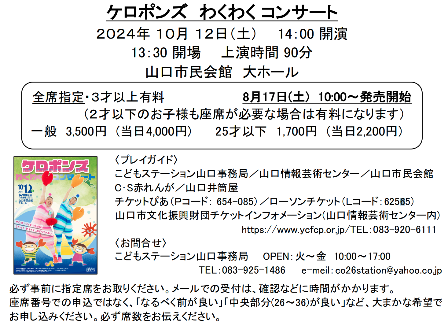 全席指定・3才以上有料(2才以下のお子様も座席が必要な場合は有料になります)